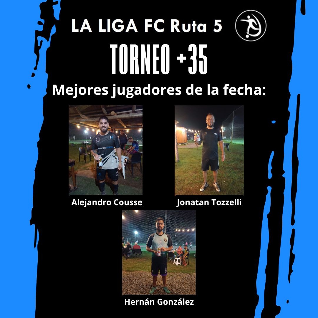 El jueves 27 de marzo, la acción del Torneo +35 en La Liga FC Ruta 5 volvió a iluminar el predio ubicado en Ruta 5 y calle 114. Los Cerveceros FC iniciaron la jornada con una contundente victoria sobre Autoservicio Axel y Alex, imponiéndose por 4 a 1. En un segundo encuentro cargado de emociones, Imprenta Mercedes se llevó el triunfo frente a Fútbol de Barrio con un marcador de 6 a 3.