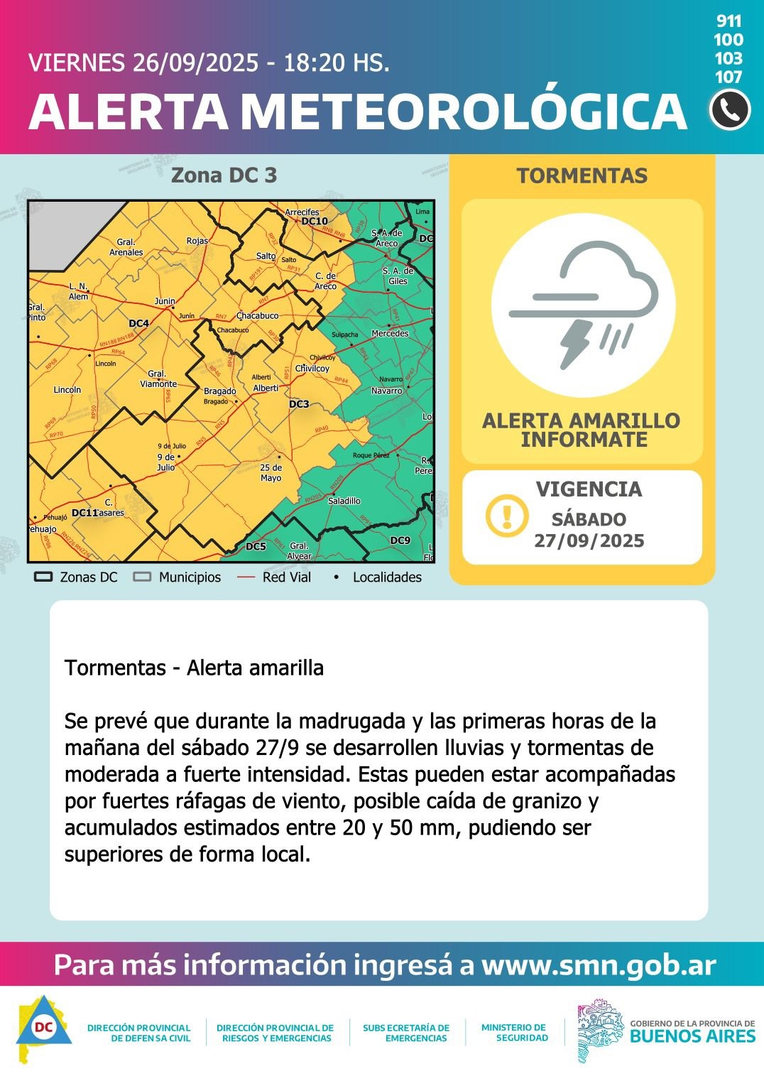 Este sábado 27 de septiembre, Mercedes y los municipios vecinos estarán bajo alerta amarilla por condiciones meteorológicas adversas. Según el Servicio Meteorológico Nacional, se prevé la llegada de vientos del sector sur con velocidades entre 35 y 55 km/h, y ráfagas que podrían superar los 75 km/h en algunos sectores.