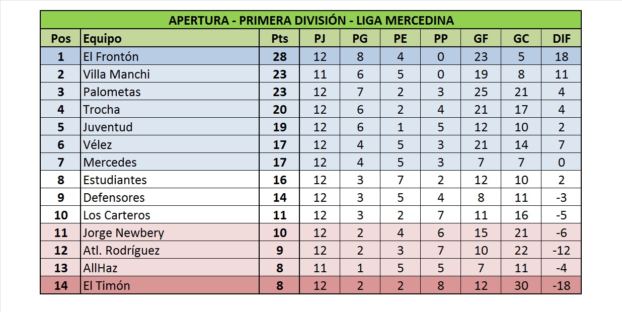 En tanto, los últimos tres puestos de la liguilla se definirán en la última jornada. Al momento los ocupan Juventud (19 pts.), Vélez (17) y Mercedes (17) pero de cerca buscan un lugar Estudiantes (16) y Defensores (14).