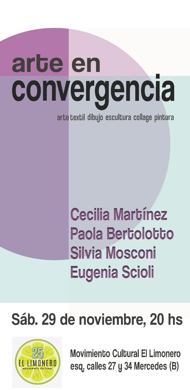 El próximo sábado 29 noviembre, quedará abierta al público la muestra “Arte en convergencia” en la cual participarán las artistas visuales María Cecilia Martínez, Silvia Mosconi, Paola Bertoloto y María Eugenia Scioli.