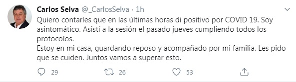 A través de los medios nacionales, el dirigente político del justicialismo explicó que obtuvo su resultado positivo este miércoles • Selva es uno de los seis pacientes confirmados esta noche en la comunicación oficial local.