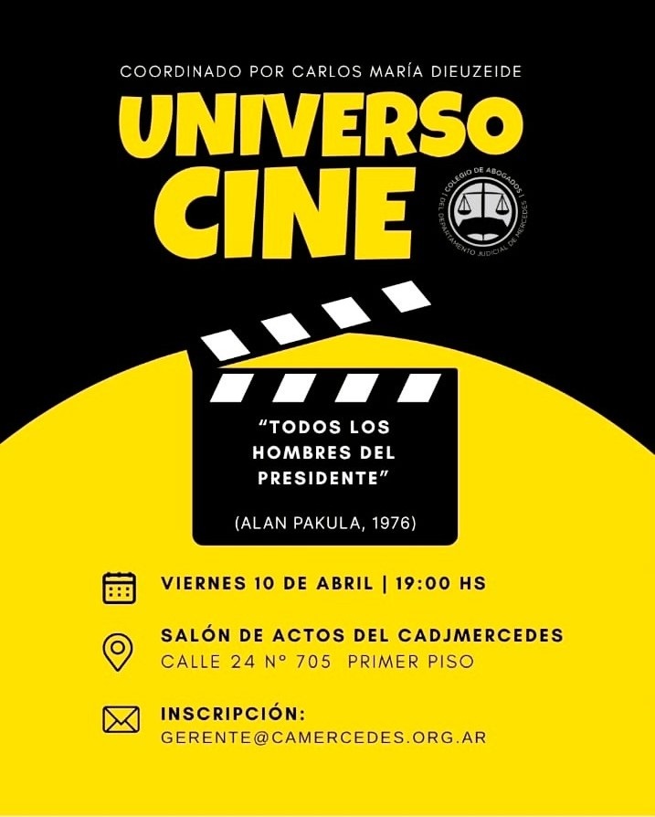 El Colegio de Abogados del Departamento Judicial de Mercedes (CADJM) continúa con su ciclo cultural “Universo Cine”, acercando obras fundamentales de la cinematografía a la comunidad. En esta ocasión, la propuesta será la proyección de “Todos los hombres del presidente” (1976), dirigida por Alan Pakula, pieza clave del cine político y periodístico que narra la investigación de los periodistas del Washington Post, Carl Bernstein y Bob Woodward, sobre el escándalo Watergate.