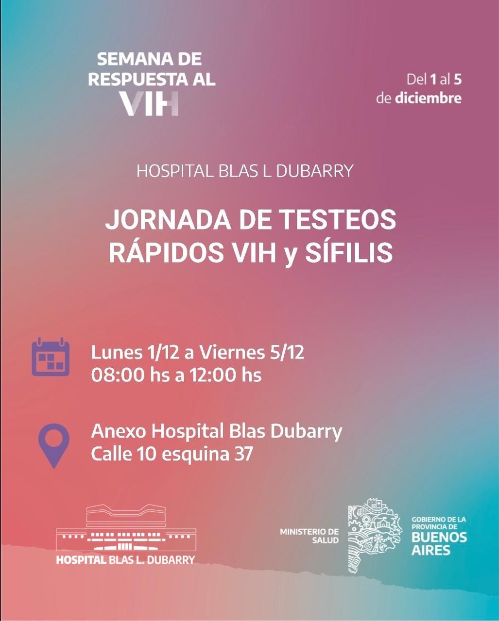 En el marco de la Semana Provincial de Prevención del VIH, el Hospital Blas L. Dubarry llevará adelante una serie de jornadas de testeo rápido de VIH y Sífilis, abiertas a toda la comunidad. Las actividades se desarrollarán del lunes 1 al viernes 5 de diciembre, en el horario de 8 a 12 horas, en el Anexo del Hospital, ubicado en calle 10 esquina 37.
