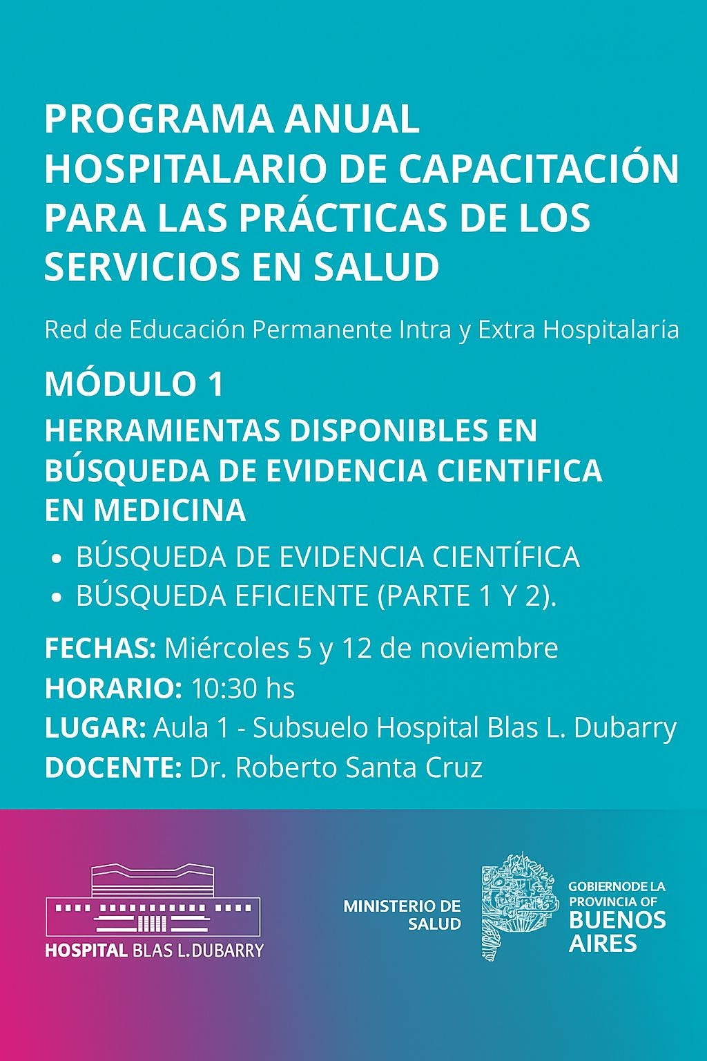 - Módulo 1: Herramientas disponibles en búsqueda de evidencia científica en Medicina Miércoles 5 y 12 de noviembre – 10:30 hs Docente: Dr. Roberto Santa Cruz