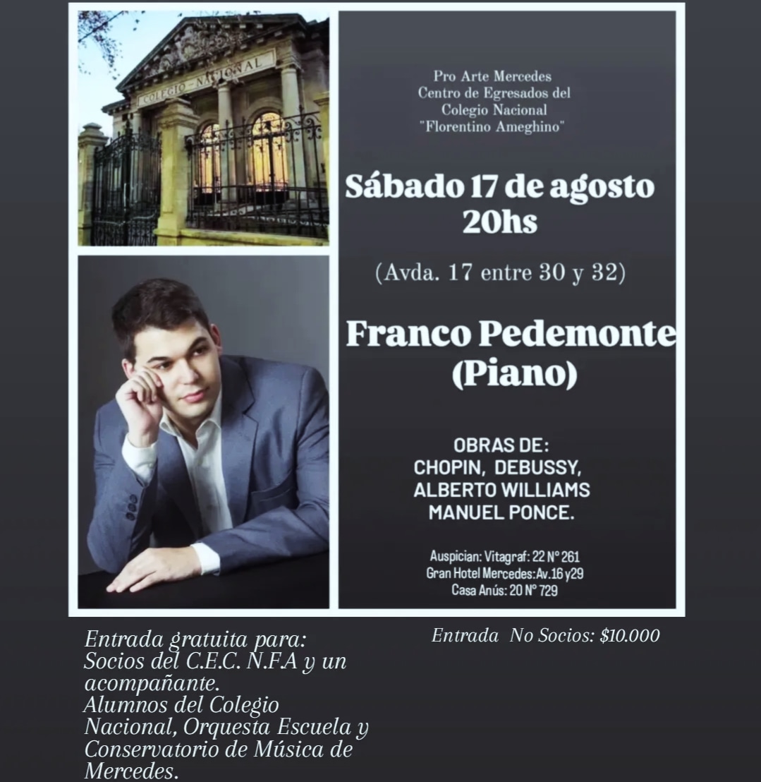 La entrada tiene un valor de 10 mil pesos, mientras que los socios del Centro de Egresados, alumnos del Colegio Nacional, Orquesta Escuela y Conservatorio de Música de Mercedes tendrán el acceso de forma gratuita.