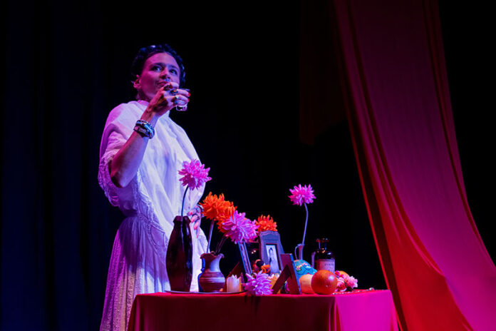 “En un día de muertos, Frida Kahlo espera a sus invitados. Mientras cocina y prepara el altar, evoca en detalle sus pasiones y dolores. La pintura, su niñez, su vínculo con Diego Rivera, expone su opinión sobre los artistas, sobre México, Estados Unidos, Francia y surge inevitablemente el recuerdo del accidente y la presencia de la muerte. Un monólogo entre el dolor, la pasión y el amor”. Bajo la dirección de Julia Morgado el público local podrá ver en escena una obra que fue montada en 28 países.
