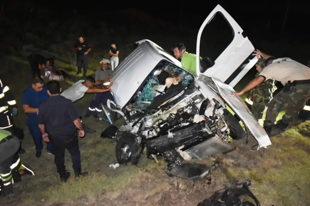 Luego de la violenta colisión con el acoplado sin control, el utilitario sale despedido hacia banquina de la mano contraria, donde finaliza dentro de la zona de préstamo volcado sobre su lateral derecho con sus cuatro ocupantes atrapados en el interior del vehículo.