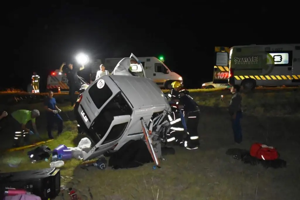 Luego de la violenta colisión con el acoplado sin control, el utilitario sale despedido hacia banquina de la mano contraria, donde finaliza dentro de la zona de préstamo volcado sobre su lateral derecho con sus cuatro ocupantes atrapados en el interior del vehículo.
