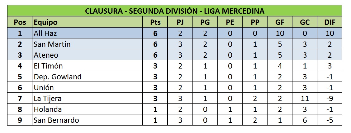 En Segunda, solo se disputó el cruce entre Holanda y San Bernardo, el cual correspondía la jornada dos. Fue empate y por el momento lideran Barrio San Martín, Ateneo y All Haz que aún debe su partido ante El Timón de Jáuregui por la fecha uno.