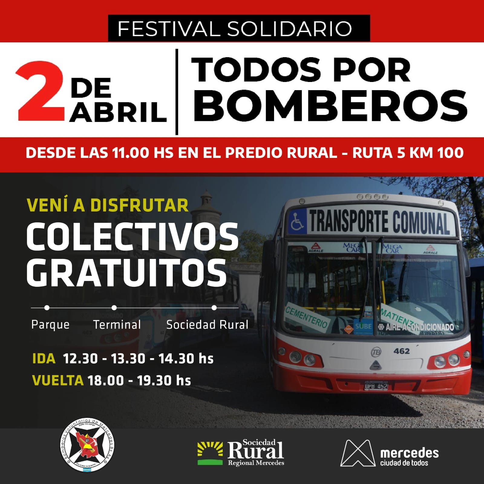 Este domingo se desarrollará el festival solidario “Todos por Bomberos” en La Rural. Desde la Municipalidad se dispusieron colectivos gratis para que las y los vecinos puedan asistir y colaborar con la respetada y querida institución.