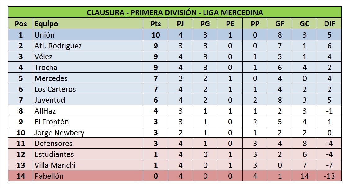 En Primera, el clásico mercedino quedó en manos del Club Mercedes que se lo ganó a Vélez sobre la hora cortándole el invicto. En tanto, Atlético Rodríguez superó de local a Estudiantes y se suma como escolta de Unión al igual que los del “molino”. All Haz logró su primera victoria en el Clausura mientras que Villa Manchi cayó ante Juventud en Suipacha y aún sigue sin conocer la victoria en Primera División.