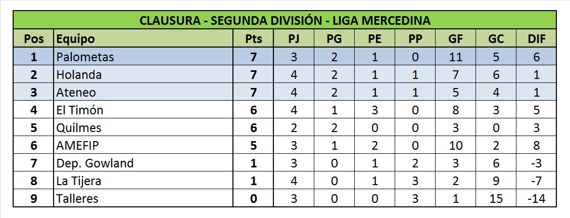 En Segunda, se completó la cuarta jornada y las primeras posiciones de la tabla comienzan a achicarse. Hasta el pasado fin de semana Holanda y Palometas lideraban el certamen pero tras superar a Talleres, el que se suma a los de arriba es Ateneo. Por su parte, El Timón de Jáuregui goleó a la Tijera y al igual que Quilmes que superó a Deportivo Gowland se ubican como escoltas a solo un punto. Sin embargo, el “cervecero” debe un encuentro de las jornadas iniciales que se llevará a cabo este miércoles. De ganar llegaría como único líder a la quinta fecha.