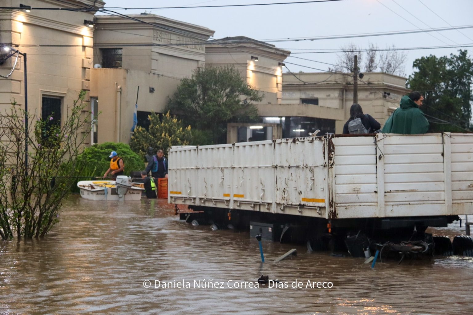El Hospital Zerboni se encuentra rodeado por el agua, obligando a utilizar el puente de emergencia y botes para acceder a sus instalaciones. En el sector de Héroes de Malvinas y Matheu, la corriente avanza con fuerza, extendiéndose hacia Lavalle, mientras que desde la costanera el nivel sigue subiendo en dirección a la plaza por Arellano.