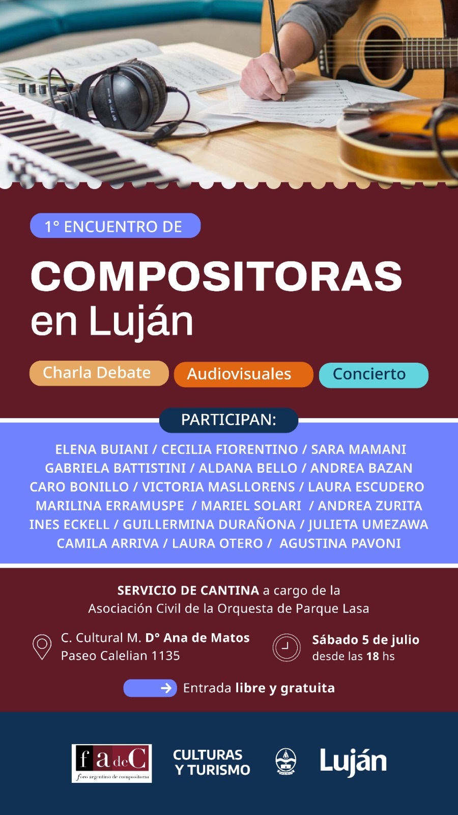 La actividad, organizada por Patricia Bisso, Gabriela Battistini, la Secretaría de Culturas y Turismo del Municipio de Luján y el Foro Argentino de Compositoras (FADEC), contará con el respaldo de la comuna y propone una programación abierta y diversa, tanto en estilos musicales como en formatos artísticos.