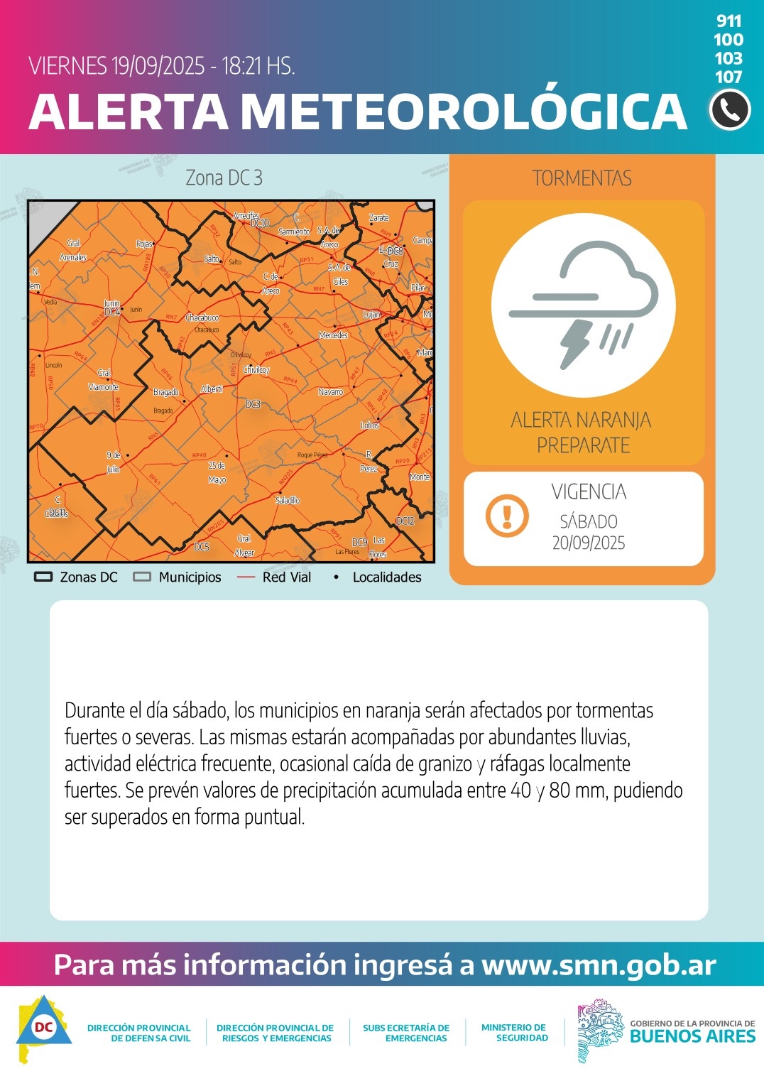 Las autoridades recomiendan mantenerse informados a través de los canales oficiales y tomar precauciones ante la posibilidad de anegamientos, cortes de energía o afectaciones en la circulación. Los números de emergencia disponibles son: 911 (seguridad), 100 (bomberos), 103 (Defensa Civil) y 107 (salud).