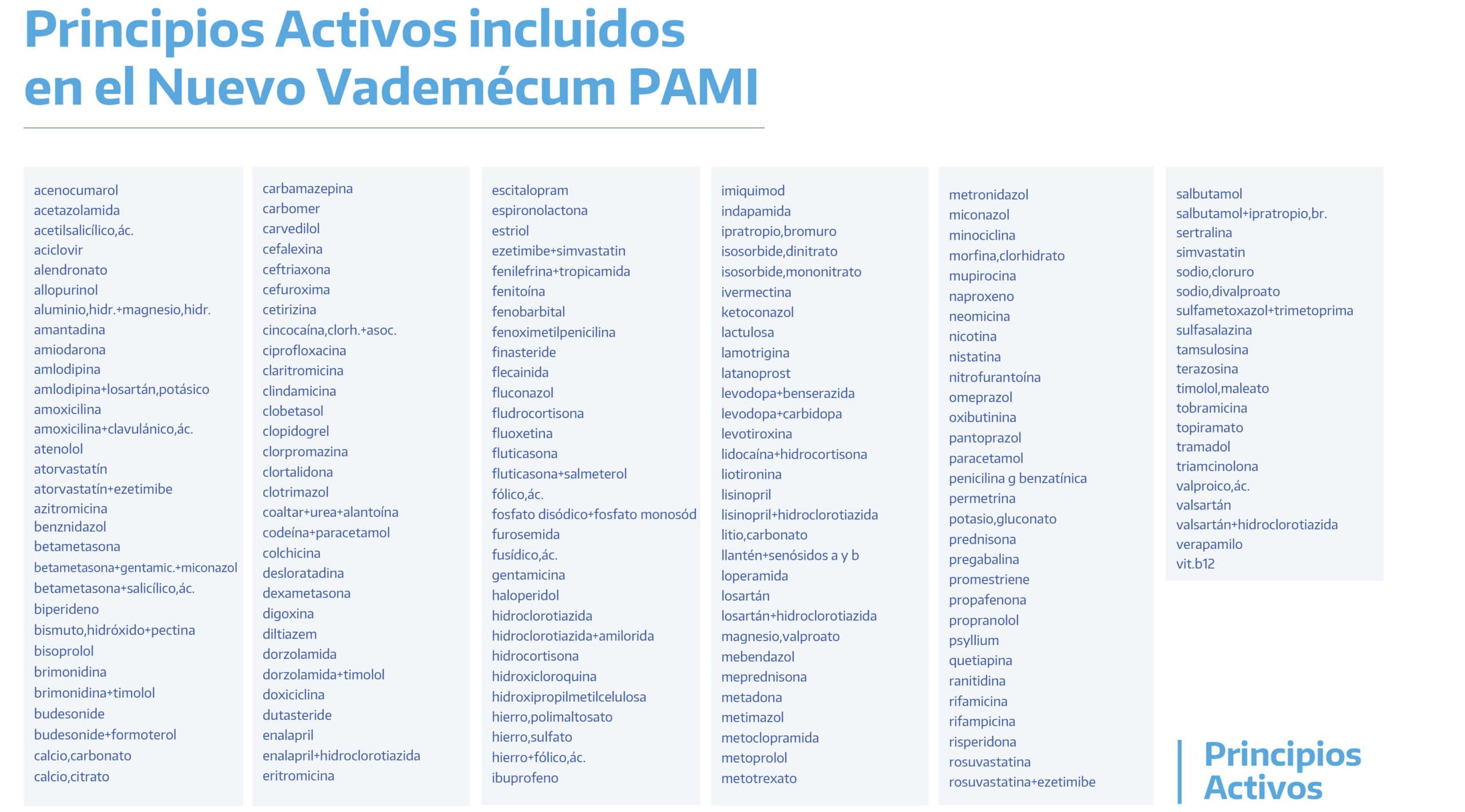 A partir del pasado miércoles, comenzaron a entregarse de manera gratuita los nuevos 170 medicamentos esenciales para los cinco millones de afiliados del PAMI. El listado, que fue presentado por el presidente Alberto Fernández junto a la titular de la obra social, Luana Volnovich, consiste en una serie de remedios seleccionados para garantizar el tratamiento adecuado de las patologías frecuentes en las personas mayores.