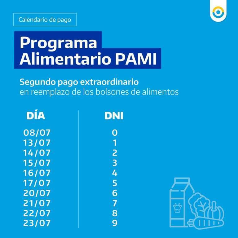 Desde este 8 de julio para los DNI terminados en 0, hasta el 23 de julio para los DNI terminado en 9, los afiliados a PAMI que son beneficiarios de los bolsones de alimentos entregados a través de los centros de jubilados, recibirán el segundo pago extraordinario de 1600 pesos a cambio de los bolsones. La suma se incorporará como concepto al recibo de haberes de julio a través de un convenio firmado con ANSES.