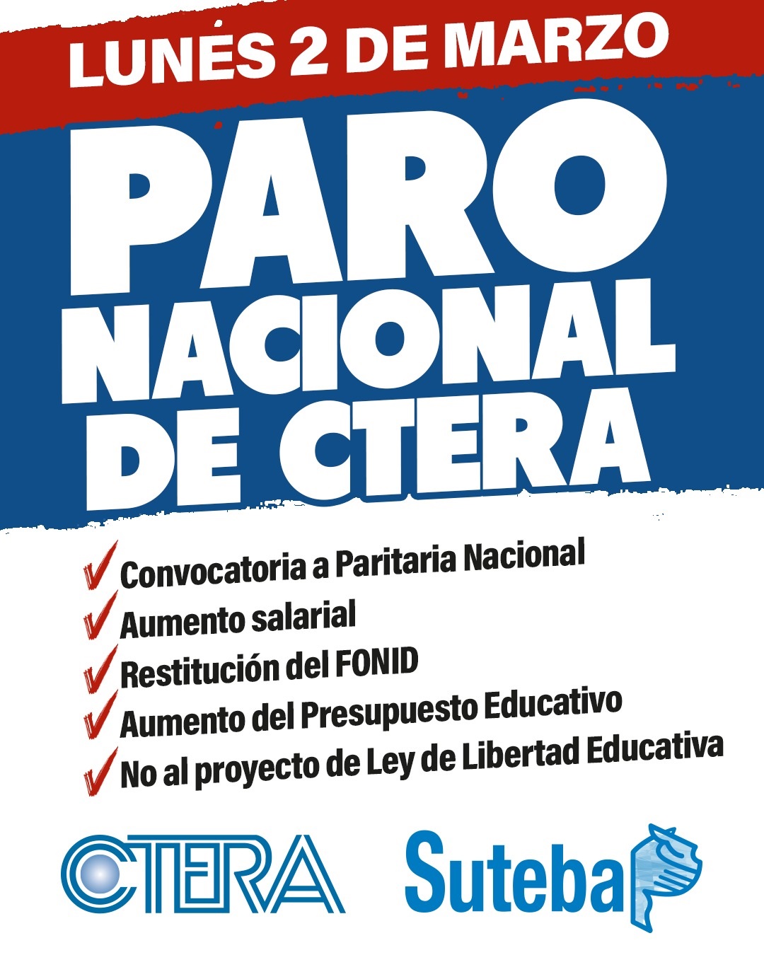 La protesta se enmarca en un plan de acción que incluye caravanas, carpas y movilizaciones en distintos puntos del país. Entre los reclamos centrales figuran la convocatoria inmediata a la paritaria nacional docente, un aumento salarial que supere la inflación, la restitución del Fondo Nacional de Incentivo Docente (FONID) y un incremento urgente del presupuesto educativo. Además, el gremio rechaza el proyecto de Ley de Libertad Educativa y advierte sobre cualquier intento de mercantilizar la enseñanza pública.