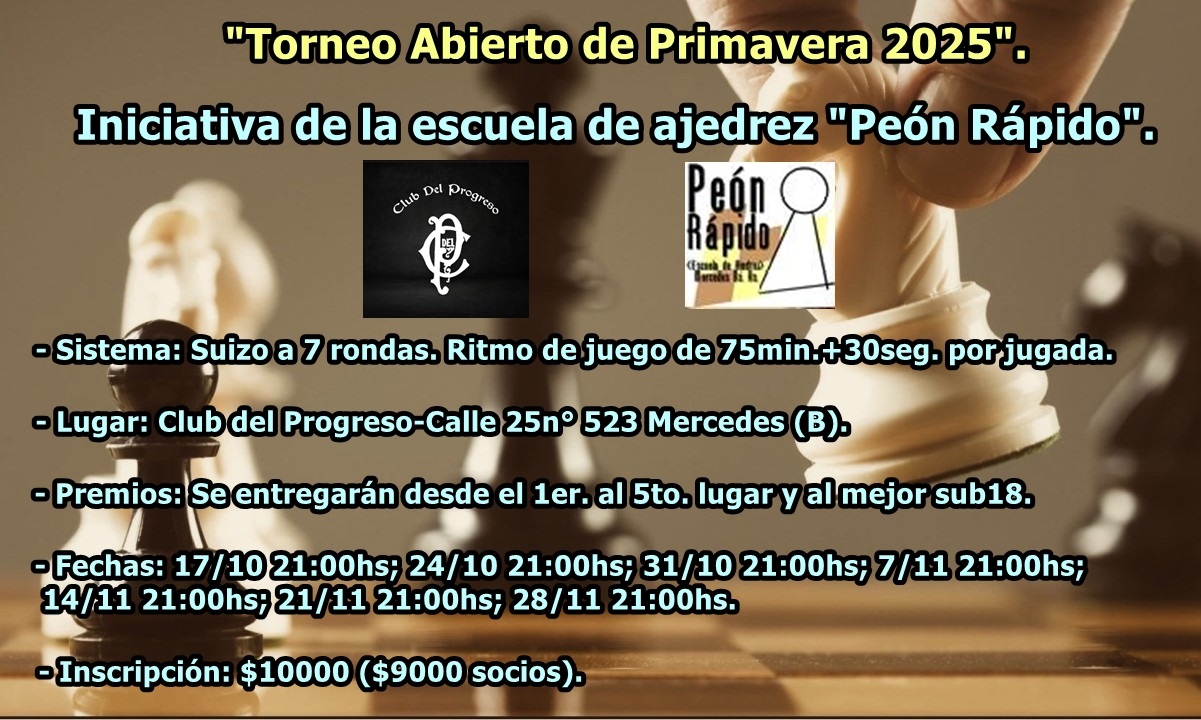 El próximo 17 de octubre comenzará el Torneo Abierto de Primavera 2025, una propuesta impulsada por la escuela de ajedrez Peón Rápido, que convoca a jugadores de todas las edades y niveles a participar en un certamen de alto nivel competitivo y espíritu formativo.