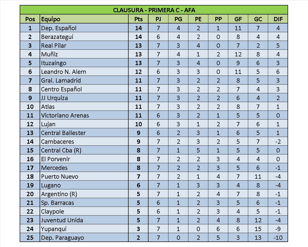 Al haberse completado la séptima fecha en su totalidad, Mercedes se ubica en el puesto 17 de la tabla con dos victorias, dos empates y dos derrotas. En tanto, Deportivo Español continúa siendo el líder del certamen pero ahora junto a Berazategui que superó a General Lamadrid en un partido clave. Real Pilar, Muñiz e Ituzaingó son los escoltas a un punto.