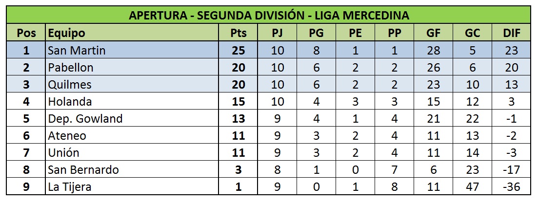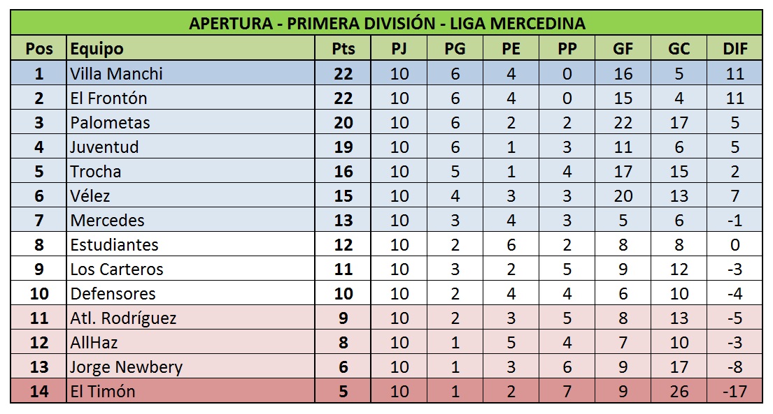 Con la 10ma fecha consumada el liderato del certamen lo llevan los dos conjuntos de San Andrés de Giles. Por un lado aparece Villa Manchi que este fin de semana goleó a El Timón, el último de la tabla. En tanto, El Frontón venía de empatar ante Estudiantes y ahora ambos son punteros con 22 puntos.