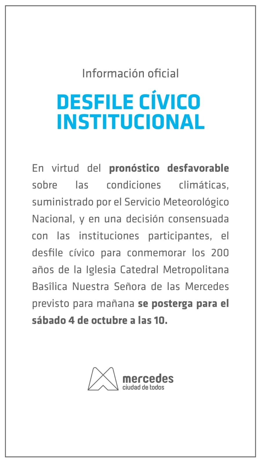 Ante el pronóstico de condiciones climáticas adversas emitido por el Servicio Meteorológico Nacional, el Desfile Cívico Institucional que conmemora el bicentenario de la Iglesia Catedral Metropolitana Basílica Nuestra Señora de las Mercedes será reprogramado.