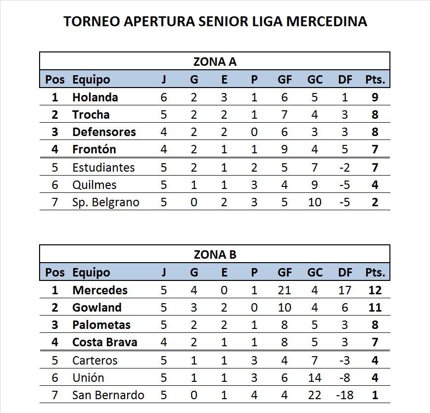 En Zona B, Mercedes ratificó su gran momento con una goleada 6-0 sobre Recreativo Unión. Emmanuel Culio fue figura con tres conquistas, acompañado por Félix Ávila y Ángel Calderón. Deportivo Gowland también cumplió: derrotó 3-0 a Carteros con doblete de Agustín Mónaco y otro tanto de Hugo Retamoso, manteniéndose a un punto del líder. El cruce entre San Bernardo y Costa Brava quedó pendiente, y Palometas descansó.