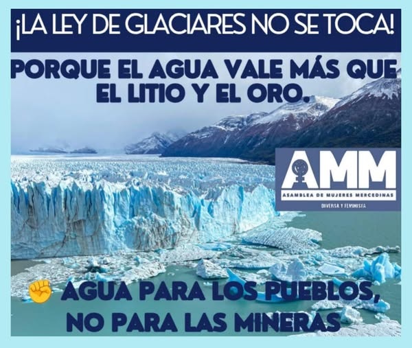En Mercedes, la AMM se suma a este rechazo y coloca la defensa del agua en el centro de la agenda comunitaria, articulando la lucha feminista y ambiental con un mensaje claro: “Ni presxs por luchar, ni saqueo de los glaciares. El agua y la vida se defienden”.